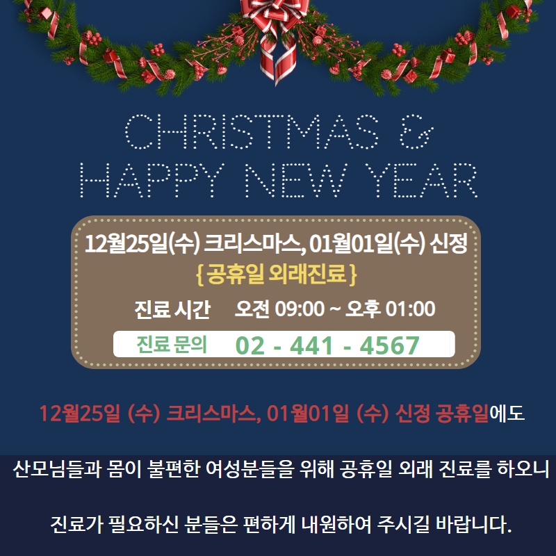 목록 12월25일(수) 크리스마스, 01월01일(수) 신정 공휴일 외래 진료 안내 (소아과는 진료 휴진) 작성자 강동드림 작성일 19-12-17 21:49 | 조회 3,154 | 댓글 0 본문 이전글다음글 목록