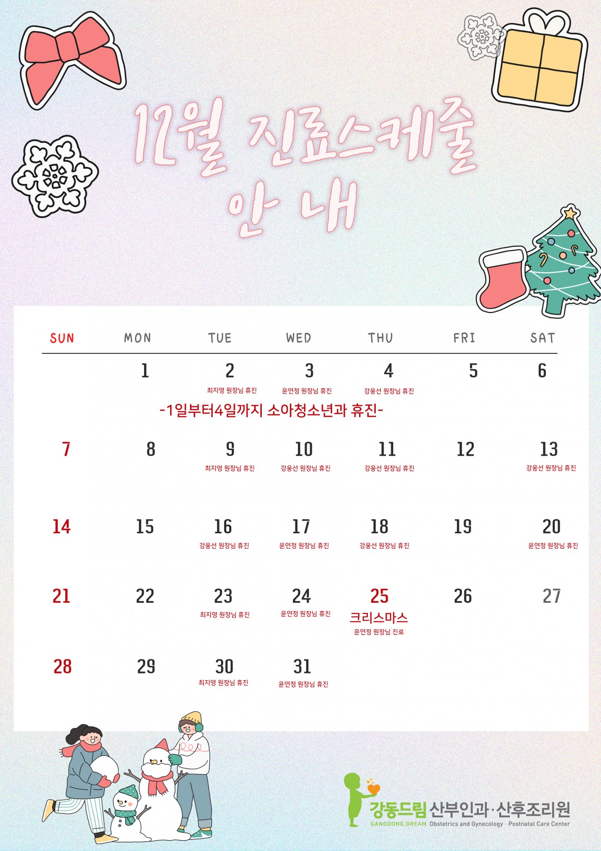 목록 12월 진료일정안내 드립니다. 작성자 강동드림 작성일 25-11-26 14:41 | 조회 28 | 댓글 0 본문 2025년 12월 일정 안내드립니다.12월1일부터 4일까지는 소아청소년과 휴진으로내원시 미리 참고 부탁드리며각 원장님별 스케줄 미리 확인 부탁드립니다. 이전글다음글 목록